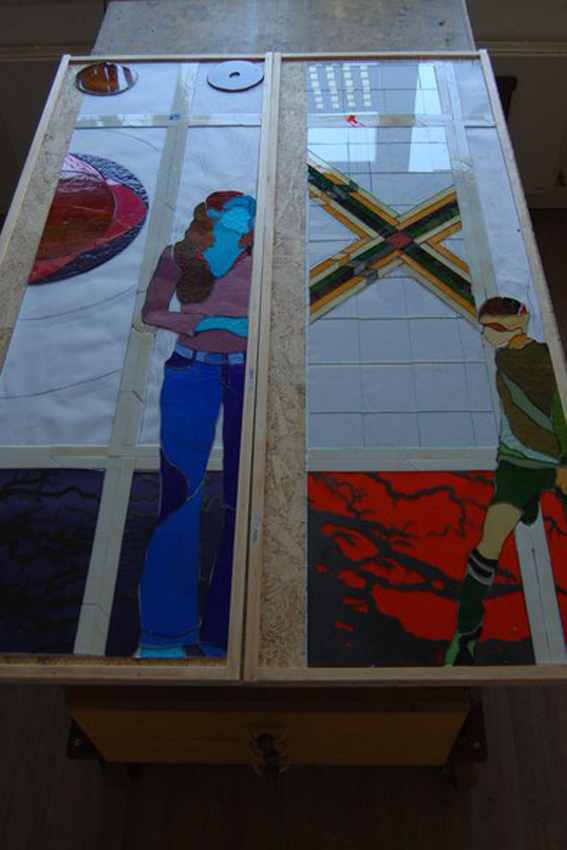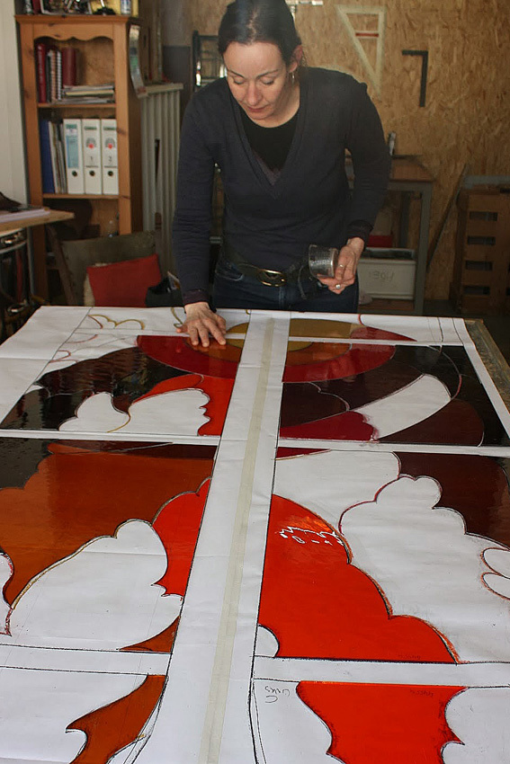 Wij maken al meer dan 12 jaar vele vierkante meters aan glas-in-loodramen volgens eenzelfde methode. Allereerst komt het ontwerp op ware grootte op papier te staan. Dan volgt het verzamelen van de platen glas, die eventueel (deels) een extra technische bewerking hebben ondergaan. Vervolgens snijden we heel secuur alle ruitjes in model, totdat de tekening geheel is opgevuld.