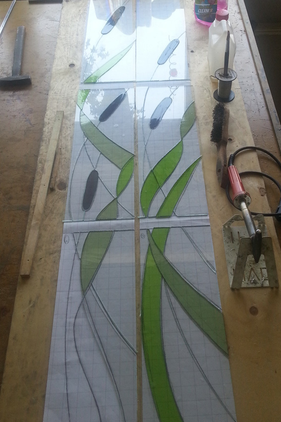 Dan volgt het glas-in-loodzetten, het buigen van het lood om het glas.De kruispunten worden daarna aan elkaar gesoldeerd. Als het raam niet in dubbel glas wordt gezet dan volgt nog het laatste stadium; het inwassen met glas-in-loodkit.